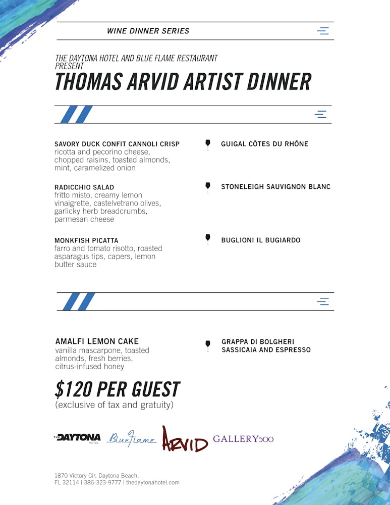 Discover an enchanting evening where fine art, exquisite wine and exceptional dining converge, showcasing the work of renowned artist Thomas Arvid.